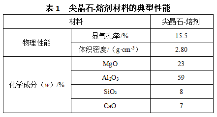 無碳材料被廣泛應(yīng)用于浸入式水口,原因是它們能在連鑄過程中抑制耐火材料內(nèi)部產(chǎn)生CO和SiO氣體,通過限制石墨溶解到鋼水中來保持工作表面光滑,起到防堵效果。品川公司選用新開發(fā)的無碳材料——尖晶石-熔劑材料,作為浸入式水口內(nèi)腔材料,選擇尖晶石是因?yàn)榉脚麂撏ǔR?jīng)過鈣處理,而堿性材料對(duì)這類鋼的抗侵蝕性更好。表1顯示了所用尖晶石-熔劑材料的典型性能。